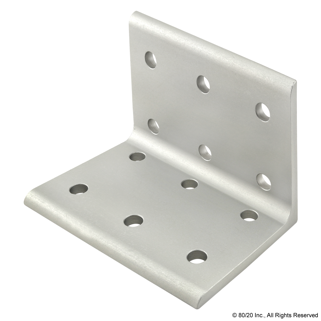 THE 12 HOLE - WIDE INSIDE CORNER BRACKET IS AN EXTERNAL FASTENING METHOD THAT CREATES A 90 DEGREE CONNECTION. EACH SIDE OF THE BRACKET HAS SIX HOLES COMPRISED OF TWO ROWS AND THREE COLUMNS. THIS FASTENER REQUIRES NO MACHINING SERVICES AND CAN PROVIDE INFINITE POSITIONING ALONG THE PROFILE T-SLOT, ALLOWING A LARGE DEGREE OF ADJUSTABILITY. THE 12 HOLE - WIDE INSIDE CORNER BRACKET ENGAGES THE 2-DEGREE DROP-LOCK FEATURE WHEN THE ASSEMBLY BOLTS ARE TIGHTENED TO THE REQUIRED TORQUE. IT IS A FASTENING METHOD THAT CAN BE REPOSITIONED AND REUSED. THE SUGGESTED MOUNTING HARDWARE CAN BE FOUND ON THE "SUGGESTED HARDWARE" TAB. ,