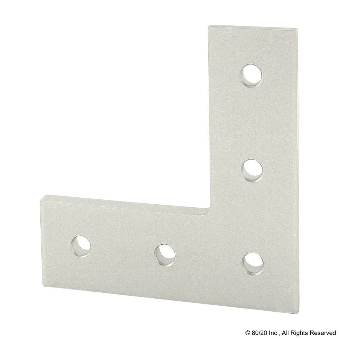 THE 5 HOLE - "L" FLAT PLATE IS A STRONG, EXTERNAL FASTENING METHOD OFFERING A LONG-LASTING CONNECTION. THIS FLAT PLATE CREATES A 90-DEGREE ANGLE BETWEEN PROFILES AND IS TYPICALLY USED TO FORM A CORNER CONNECTION. THE FASTENER IS FLUSH WITH THE PROFILES, ALLOWING FOR A LARGER CLEARANCE AREA. IT REQUIRES NO MACHINING SERVICES, IS EASY TO ASSEMBLE, AND CAN BE RECONFIGURED AND REUSED. THE SUGGESTED MOUNTING HARDWARE FOR THE €œL€ PLATE CAN BE FOUND ON THE "SUGGESTED HARDWARE" TAB. TIP: USE DOUBLE OR TRIPLE SLIDE-IN ECONOMY T-NUTS TO SAVE TIME AND MONEY. PRE-LOAD YOUR HARDWARE PRIOR TO CONNECTING PROFILES TO SIMPLIFY YOUR ASSEMBLY.