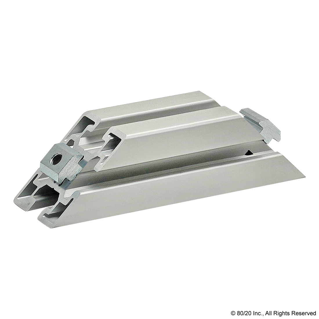 THE 45 DEGREE SUPPORT ASSEMBLY INCLUDES SOCKET HEAD CAP SCREWS, WASHERS AND T-NUTS. THE SUPPORT ASSEMBLY IS PRE-MACHINED WITH COUNTERBORES AND A 45 DEGREE MITER ANGLE ON BOTH ENDS. THIS FASTENING METHOD PROVIDES A CLEAN, FLUSH CONNECTION AND IS TYPICALLY USED TO REINFORCE A 90 DEGREE CONNECTION. THIS CONNECTION LENDS ITSELF TO APPLICATIONS WITH HEAVY LOADS TO MINIMIZE BEAM DEFLECTION.