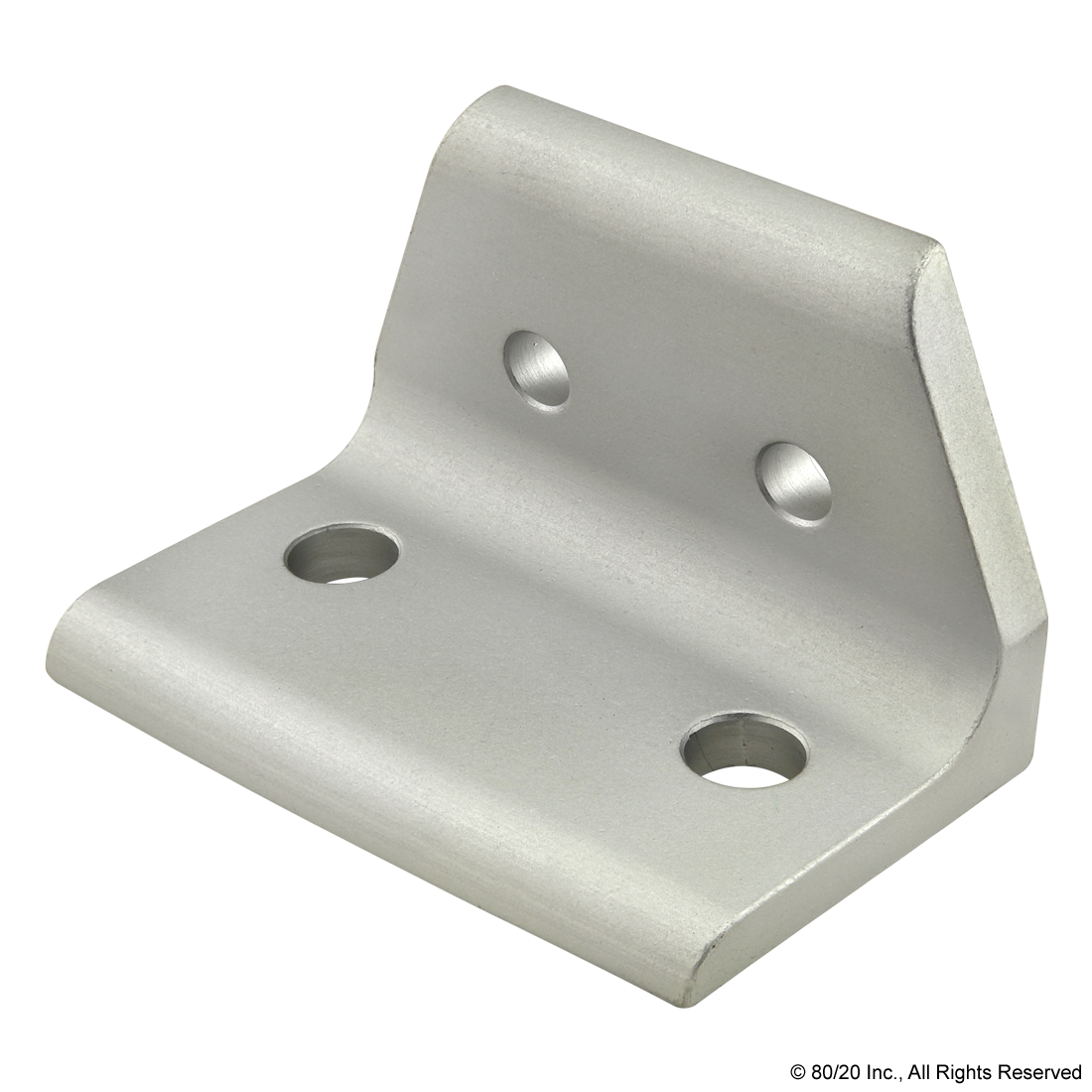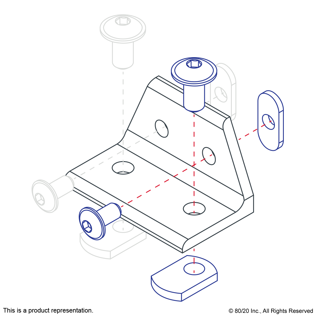 THE 4 HOLE - WIDE TRANSITION INSIDE CORNER BRACKET CREATES A 90 DEGREE CONNECTION BETWEEN PROFILES WITHIN THE SAME PRODUCT TYPE (EITHER FRACTIONAL OR METRIC) BUT OF DIFFERING SERIES. IT HAS TWO ADJACENT HOLES ON EACH SIDE AND IS AN EXTERNAL FASTENING METHOD THAT REQUIRES NO MACHINING SERVICES. THE BRACKET IS FLUSH WITH THE PROFILES, TAKING UP LESS SPACE IN THE OVERALL DESIGN. THIS OPTION CAN PROVIDE INFINITE POSITIONING ALONG THE PROFILE T-SLOT, ALLOWING FOR A LARGE DEGREE OF ADJUSTABILITY AS WELL AS BEING RECONFIGURABLE AND REUSABLE. THE SUGGESTED MOUNTING HARDWARE CAN BE FOUND ON THE "SUGGESTED HARDWARE" TAB.