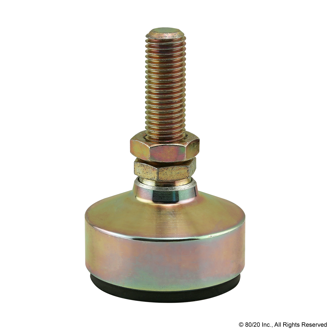 THE ECONOMY ANTI-VIBRATION MOUNT IS A FOOT THAT PIVOTS 20 DEGREES TO ACCOMMODATE UNEVEN FLOORS. IT HAS A RUBBER PAD TO PROVIDE RESISTANCE TO VIBRATION, MAKING IT USEFUL FOR HIGH-PRECISION PROJECTS OR COMPUTERIZED MACHINERY. THERE ARE OPTIONS AVAILABLE WITH LOAD CAPACITIES RANGING FROM 95-650 POUNDS (23-148 KILOGRAMS). IT MOUNTS USING A BASE PLATE AND REQUIRES AN END TAP IN THE PROFILE.,