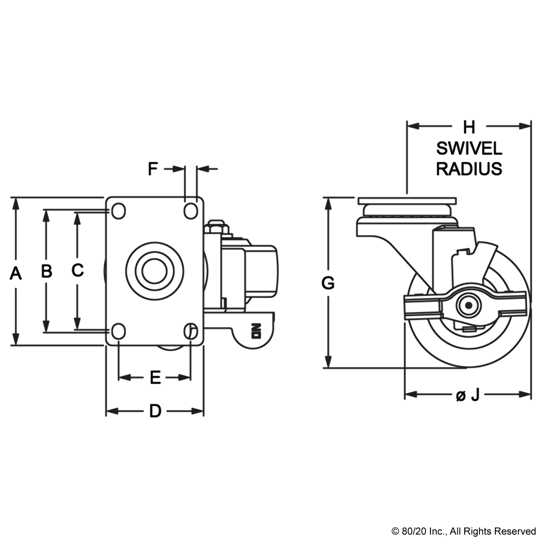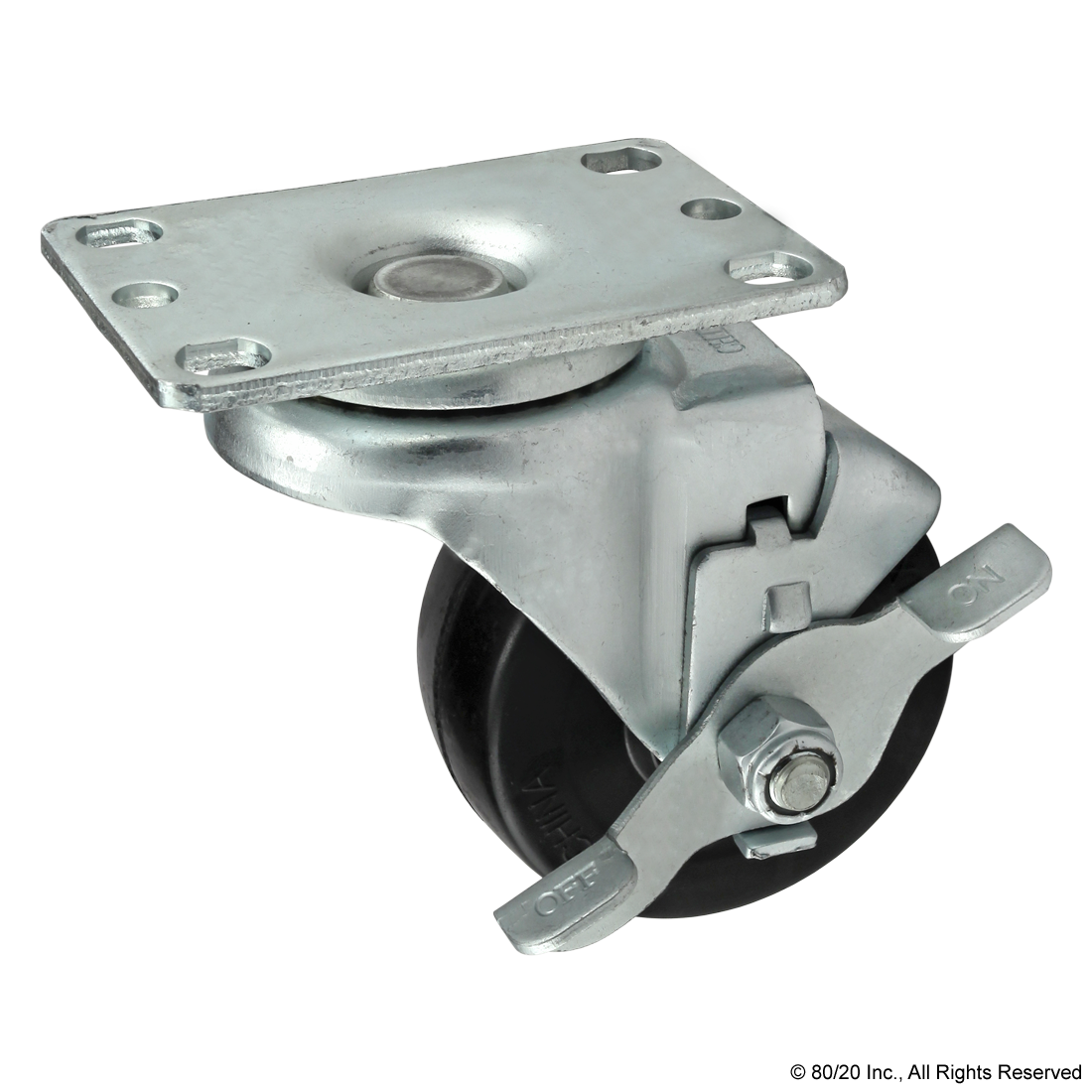 THE FLANGE MOUNT SWIVEL CASTER IS A FOOT THAT ADDS MOBILITY TO AN APPLICATION AND COMMONLY MOUNTS TO THE T-SLOT PROFILE END OR SIDE USING A BASE PLATE. THE SWIVEL ENABLES EASY MOVEMENT AND PIVOT TURNS. THERE ARE OPTIONS AVAILABLE WITH A SIDE OR FRONT MOUNT BRAKE KIT; THE SIDE BRAKE LOCKS ONLY THE WHEEL WHILE THE FRONT BRAKE LOCKS BOTH THE WHEEL AND THE SWIVEL MOTION. THIS IS IDEAL FOR USE IN INDUSTRIAL SETTINGS SUCH AS MOBILE CARTS AND MATERIAL HANDLING SOLUTIONS.