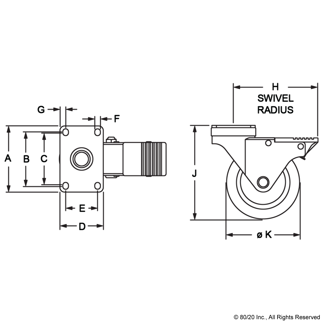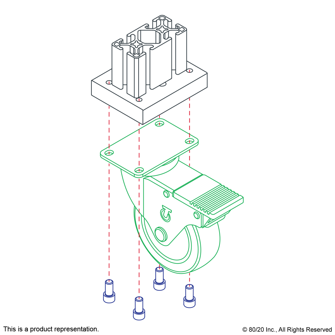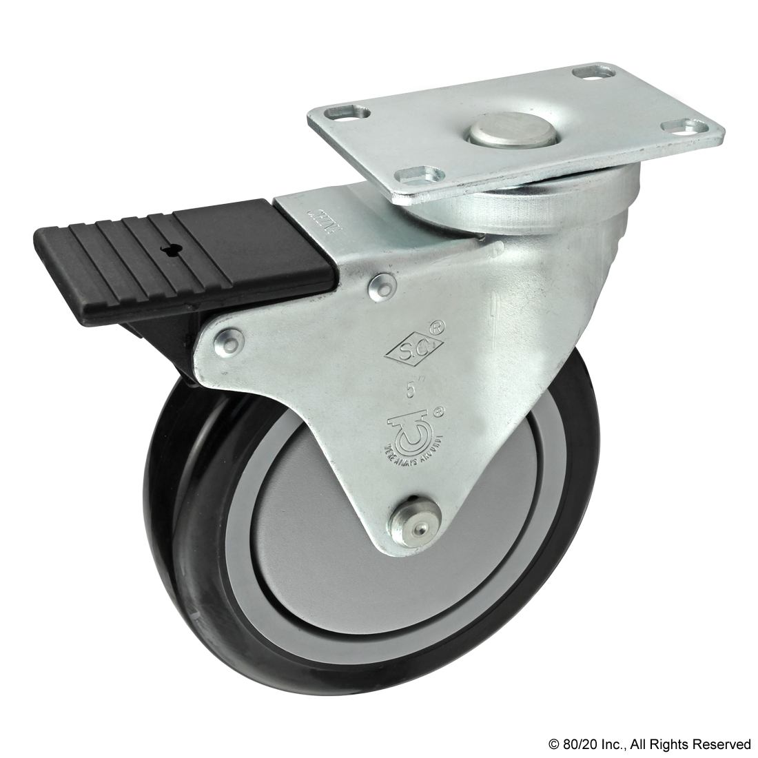 THE DELUXE FLANGE MOUNT SWIVEL CASTER IS A FOOT THAT ADDS MOBILITY TO AN APPLICATION AND COMMONLY MOUNTS TO THE T-SLOT PROFILE END OR SIDE USING A BASE PLATE. THE POLYURETHANE WHEELS AND HARDENED RACEWAYS ENABLE A SMOOTH MOTION WHILE THE SWIVEL ALLOWS EASY MOVEMENT AND PIVOT TURNS. THE DELUXE FLANGE MOUNT CASTER INCLUDES A BRAKE. IT IS IDEAL FOR USE IN INDUSTRIAL SETTINGS SUCH AS MOBILE CARTS AND MATERIAL HANDLING SOLUTIONS.