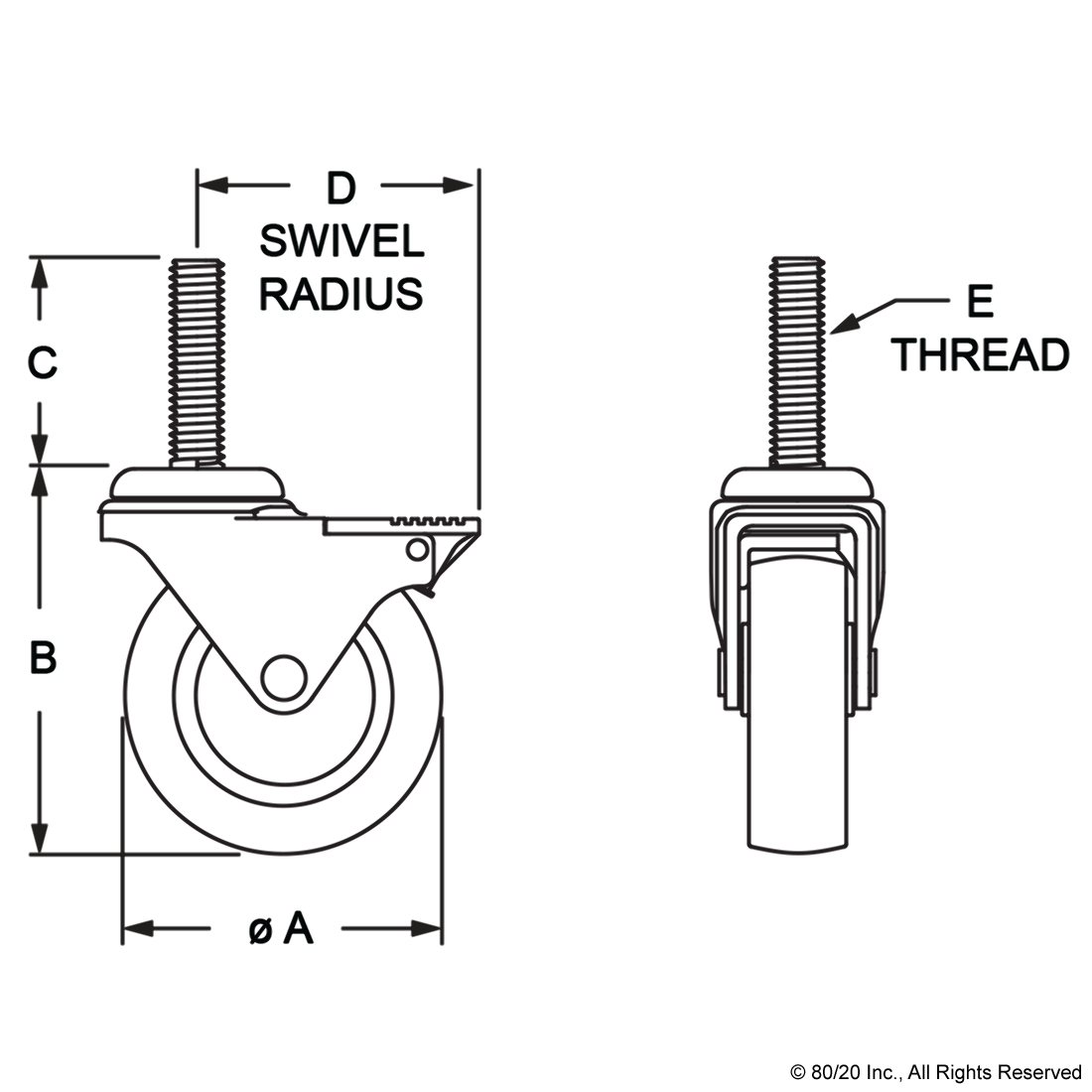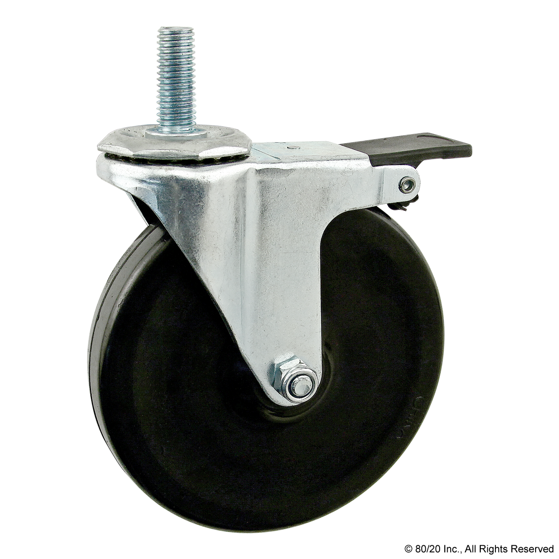 THE THREADED STEM SWIVEL CASTER IS A FOOT THAT ADDS MOBILITY TO AN APPLICATION AND CAN MOUNT DIRECTLY TO A T-SLOT PROFILE END, OR TO THE PROFILE SIDE USING A BASE PLATE. THERE ARE OPTIONS AVAILABLE WITH A SIDE OR FRONT MOUNT BRAKE KIT AS WELL AS VARIETIES WITHOUT A BRAKE. THE SWIVEL ENABLES EASY MOVEMENT AND PIVOT TURNS. IT IS OIL RESISTANT, MAKING IT IDEAL FOR USE IN INDUSTRIAL SETTINGS SUCH AS MOBILE CARTS AND WORKSTATIONS.