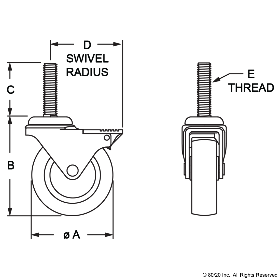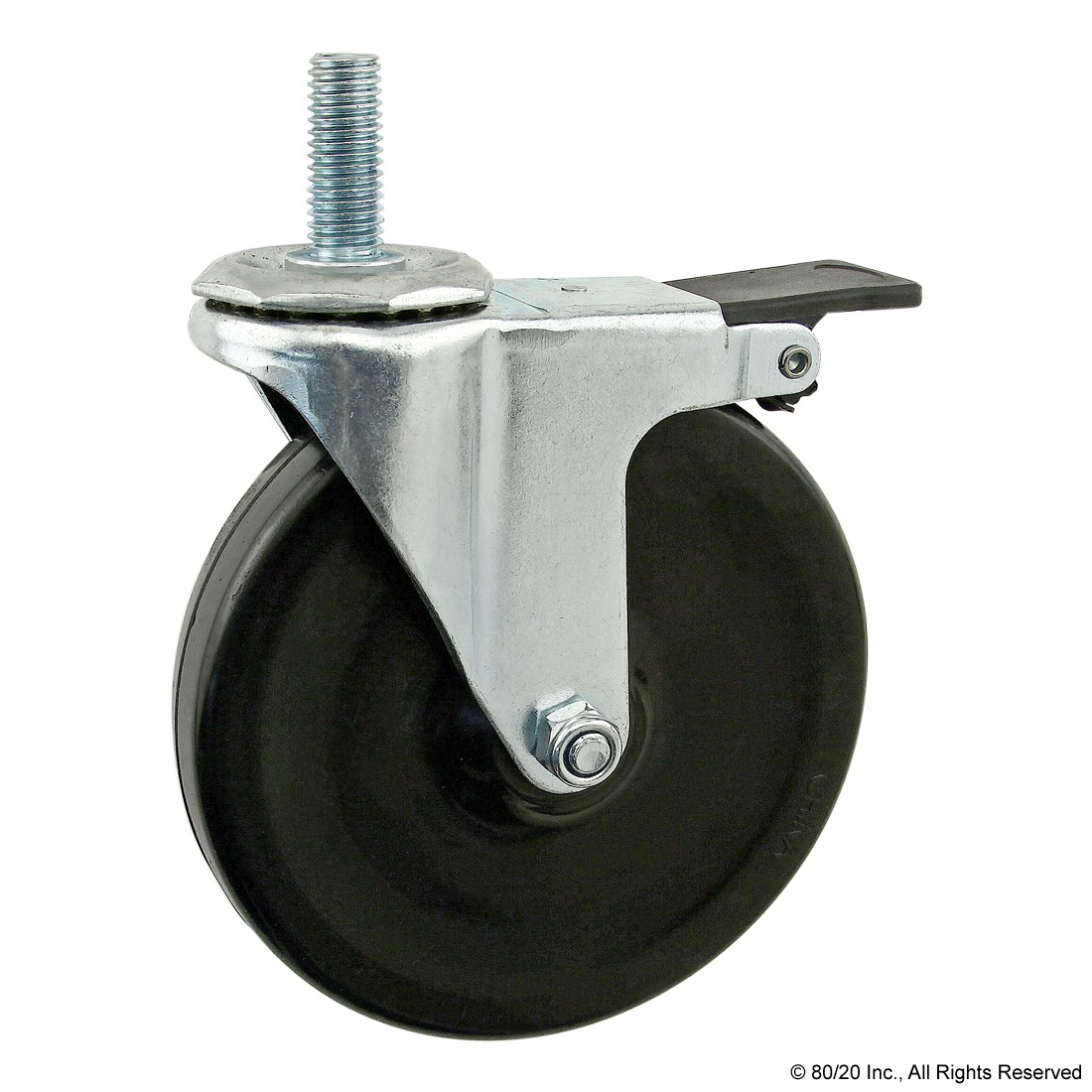 THE THREADED STEM SWIVEL CASTER IS A FOOT THAT ADDS MOBILITY TO AN APPLICATION AND CAN MOUNT DIRECTLY TO A T-SLOT PROFILE END, OR TO THE PROFILE SIDE USING A BASE PLATE. THERE ARE OPTIONS AVAILABLE WITH A SIDE OR FRONT MOUNT BRAKE KIT AS WELL AS VARIETIES WITHOUT A BRAKE. THE SWIVEL ENABLES EASY MOVEMENT AND PIVOT TURNS. IT IS OIL RESISTANT, MAKING IT IDEAL FOR USE IN INDUSTRIAL SETTINGS SUCH AS MOBILE CARTS AND WORKSTATIONS.