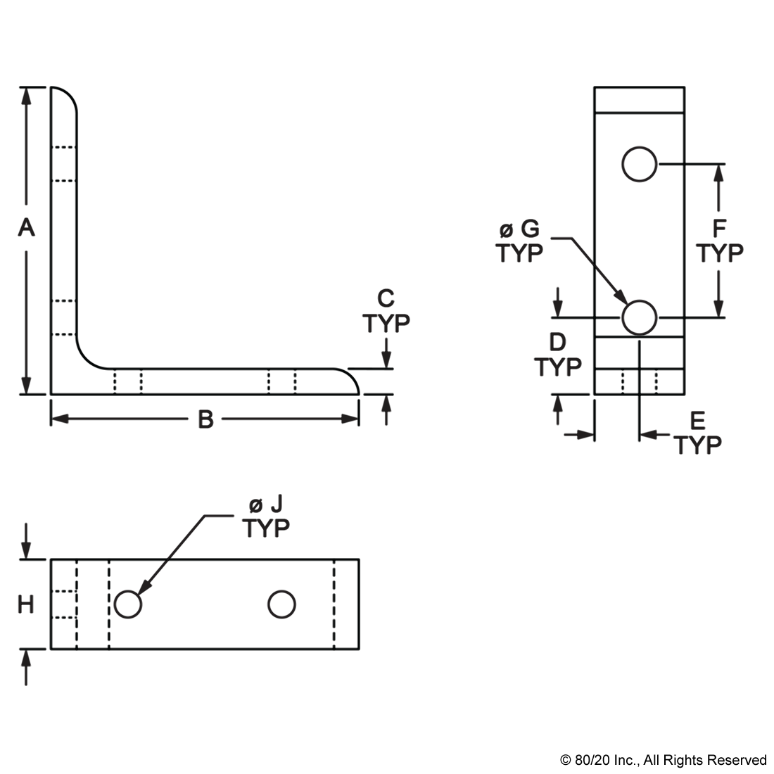 THE 4 HOLE - TALL TRANSITION INSIDE CORNER BRACKET CREATES A 90 DEGREE CONNECTION BETWEEN PROFILES WITHIN THE SAME PRODUCT TYPE (EITHER FRACTIONAL OR METRIC) BUT OF DIFFERING SERIES. EACH SIDE OF THE BRACKET HAS TWO HOLES STACKED ONE ON TOP OF THE OTHER. IT IS AN EXTERNAL FASTENING METHOD THAT REQUIRES NO MACHINING SERVICES. THE BRACKET IS FLUSH WITH THE PROFILES, TAKING UP LESS SPACE IN THE OVERALL DESIGN. THIS OPTION CAN PROVIDE INFINITE POSITIONING ALONG THE PROFILE T-SLOT, ALLOWING FOR A LARGE DEGREE OF ADJUSTABILITY AS WELL AS BEING RECONFIGURABLE AND REUSABLE. THE SUGGESTED MOUNTING HARDWARE CAN BE FOUND ON THE "SUGGESTED HARDWARE" TAB.