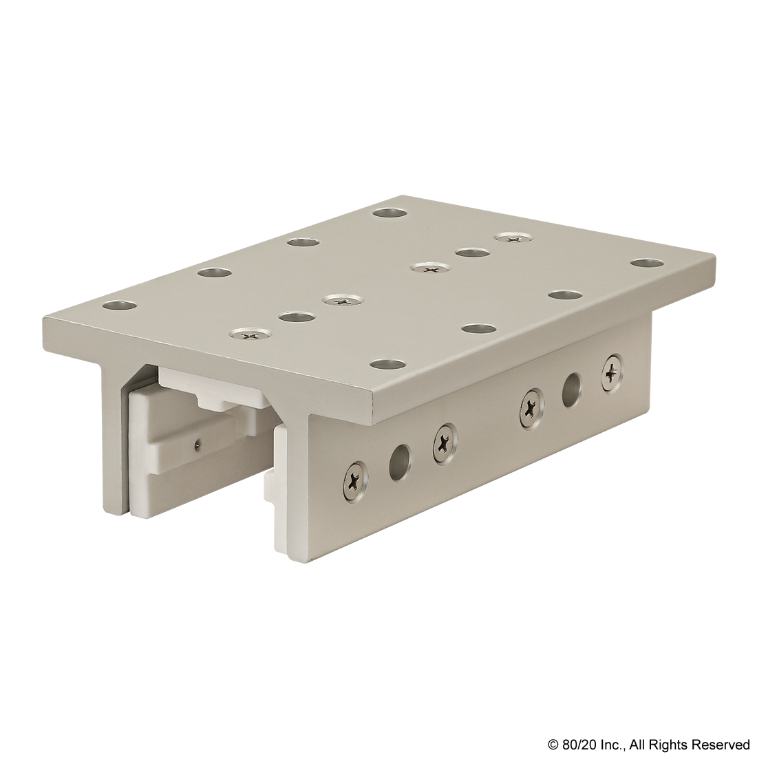 THE 3-SLOT MOUNT - DOUBLE FLANGE LONG STANDARD LINEAR BEARING WITH BRAKE HOLES IS TYPICALLY USED IN LINEAR MOTION APPLICATIONS. IT HOUSES PROFILES WITH A MINIMUM OF THREE OPEN T-SLOTS, HAS A DOUBLE FLANGE AND IS A LONGER OPTION. THE BEARING INCLUDES PADS, SCREWS AND SHIMS; THE PADS ARE MADE OF SELF-LUBRICATING UHMW. ALL 80/20 BEARINGS ARE DESIGNED FOR COMPRESSION LOADS ONLY AND NOT INTENDED TO SUPPORT HANGING LOADS.