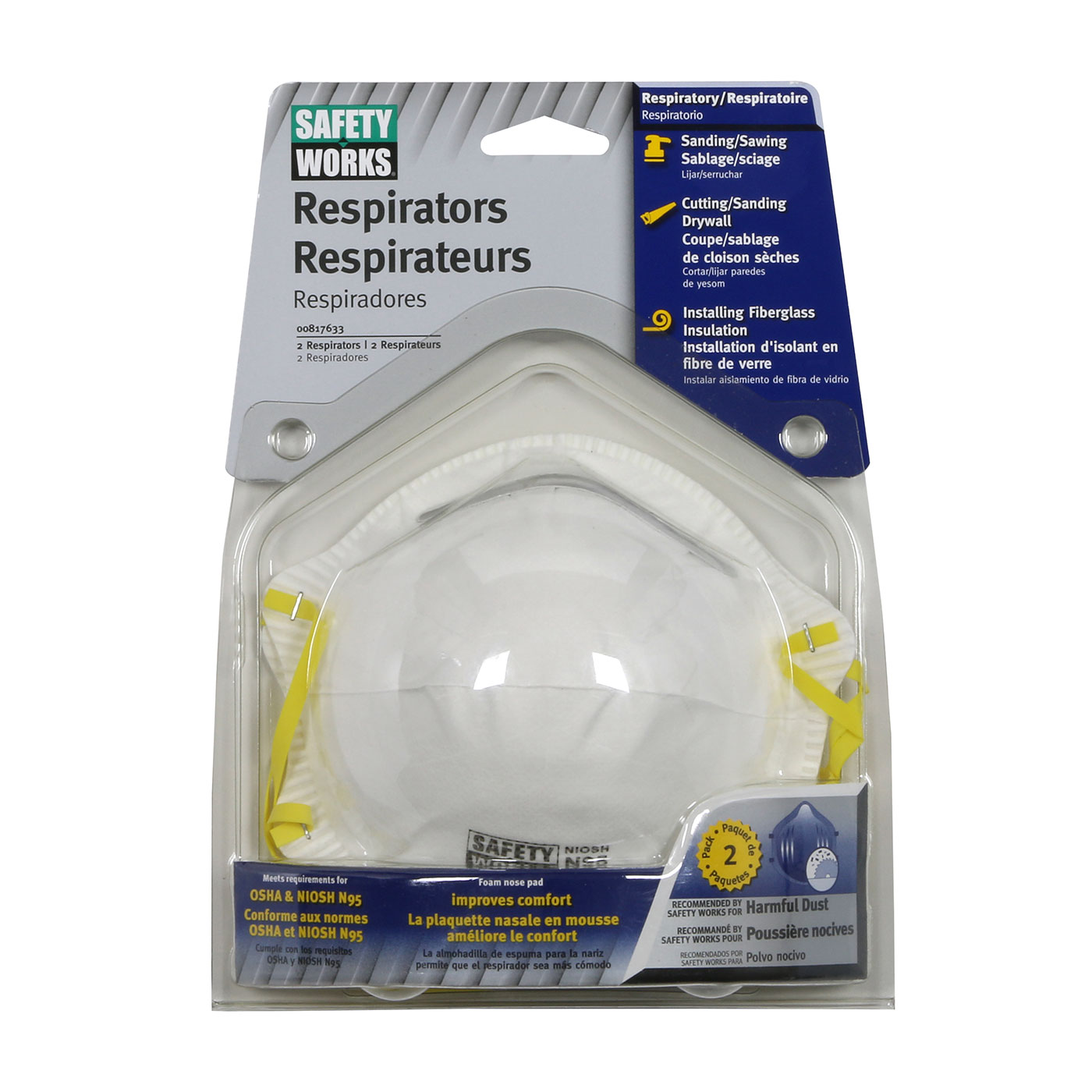 - Brand: Safety Works®Case qty: 22Case uom: eaCategory: Respiratory SafetyColor: WhiteConstruction: --Moldable Metal Noseband--Nose Pad--Grouping: Disposable MasksHead strap: ElasticNiosh n95: 1Segment: Particulate RespiratorsSize: OSSizes: --OS--Specs: NIOSH Certified|Adjustable Metal Nose Band|Cell Foam Nose Pad Latex Free|Disposable|APF 10Strap attachment: StapledStyle: 817633