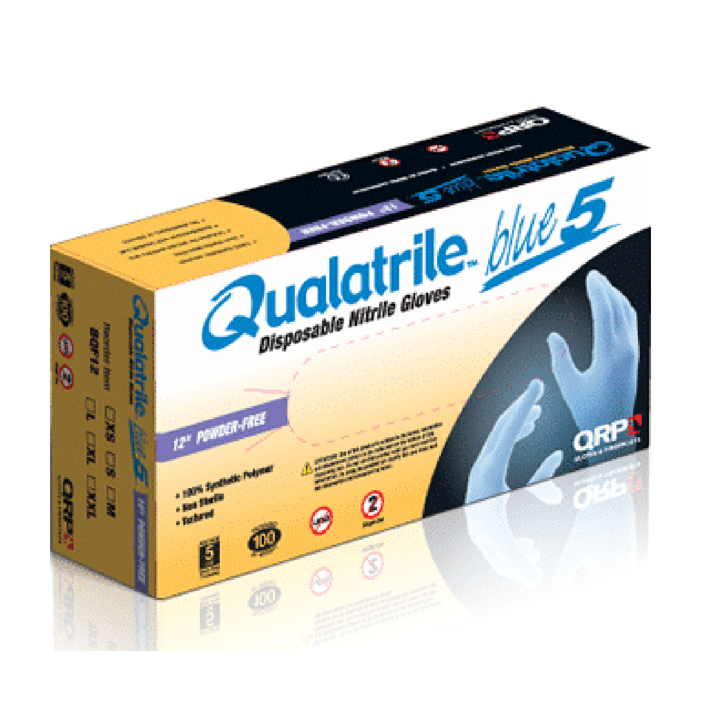 - Brand: QRP® Qualatrile®Case qty: 1000Case uom: eaCategory: Critical EnvironmentColor: BlueCuff: RolledFeatures: 3x puncture resistance of vinyl or natural rubber latex gloves|Naturally Anti-static, surface resistance 10(9) ohms|Geogrip 360sm fully textured fingers and palms|Meets ASTM D6319|Grip: TexturedGrouping: CE GlovesLength: 12Polymer: NitrilePowder: Powder FreeSegment: CE Single Use GlovesSize: MSizes: --2XL--L--M--S--XL--XS--Specs: Disposable Nitrile|5 mil Blue|Powder Free|ESD Safe|RoHS Compliant|100 Gloves per Dispenser BoxStyle: BQF12Thickness: 5