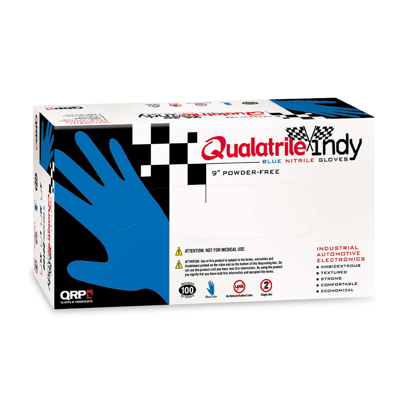 - Brand: QRP® Qualatrile®Case qty: 1000Case uom: eaCategory: Critical EnvironmentColor: BlueCuff: RolledGrip: TexturedGrouping: CE GlovesLength: 9Powder: Powder FreeSegment: CE Single Use GlovesSize: MSizes: --2XL--L--M--S--XL--Specs: Disposable Nitrile|4 Mil Blue|Industrial Grade|Powder Free|FDA 21 CFR Compliant|100 Gloves per Dispenser BoxStyle: BQY09Thickness: 4