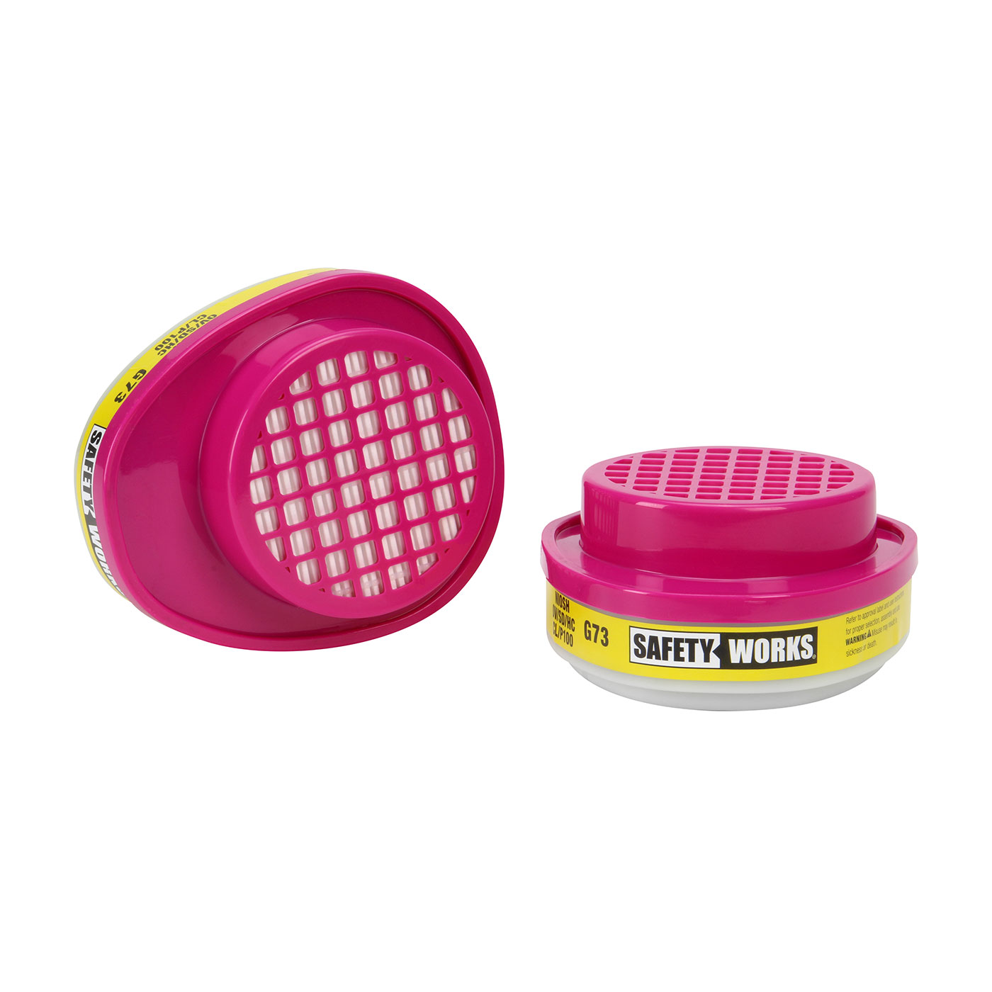 - Brand: Safety Works®Case qty: 4Case uom: prCategory: Respiratory SafetyColor: MagentaContaminants: --Chlorine--Hydrogen Chloride--Organic Vapors--Sulfur Dioxide--Grouping: CartridgesNiosh p100: 1Segment: Filters and CartridgesSize: OSSizes: --OS--Specs: Organic Vapor & Acid Gas with P100|NIOSH Approved| Compatible with Safety Works Half Mask and Full FacepieceStyle: SWX00325