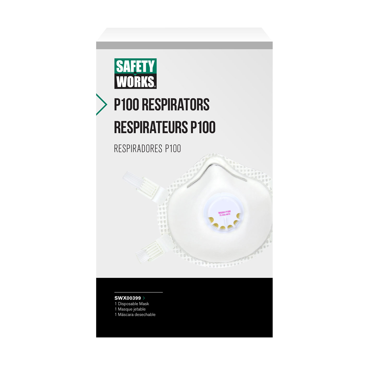 - Brand: Safety Works®Case qty: 24Case uom: bxCategory: Respiratory SafetyColor: WhiteConstruction: --Adjustable Straps--Exhalation Valve--Full Pad--Moldable Metal Noseband--Grouping: Disposable MasksHead strap: BraidedNiosh p100: 1Segment: Particulate RespiratorsSize: OSSizes: --OS--Specs: P100 Particulate Filter|NIOSH Approved|Exhalation Valve| Adjustable Head Straps|Full Foam Inner Gasket|Oversized Valve|APF 10Strap attachment: Ultrasonic WeldedStyle: SWX00399